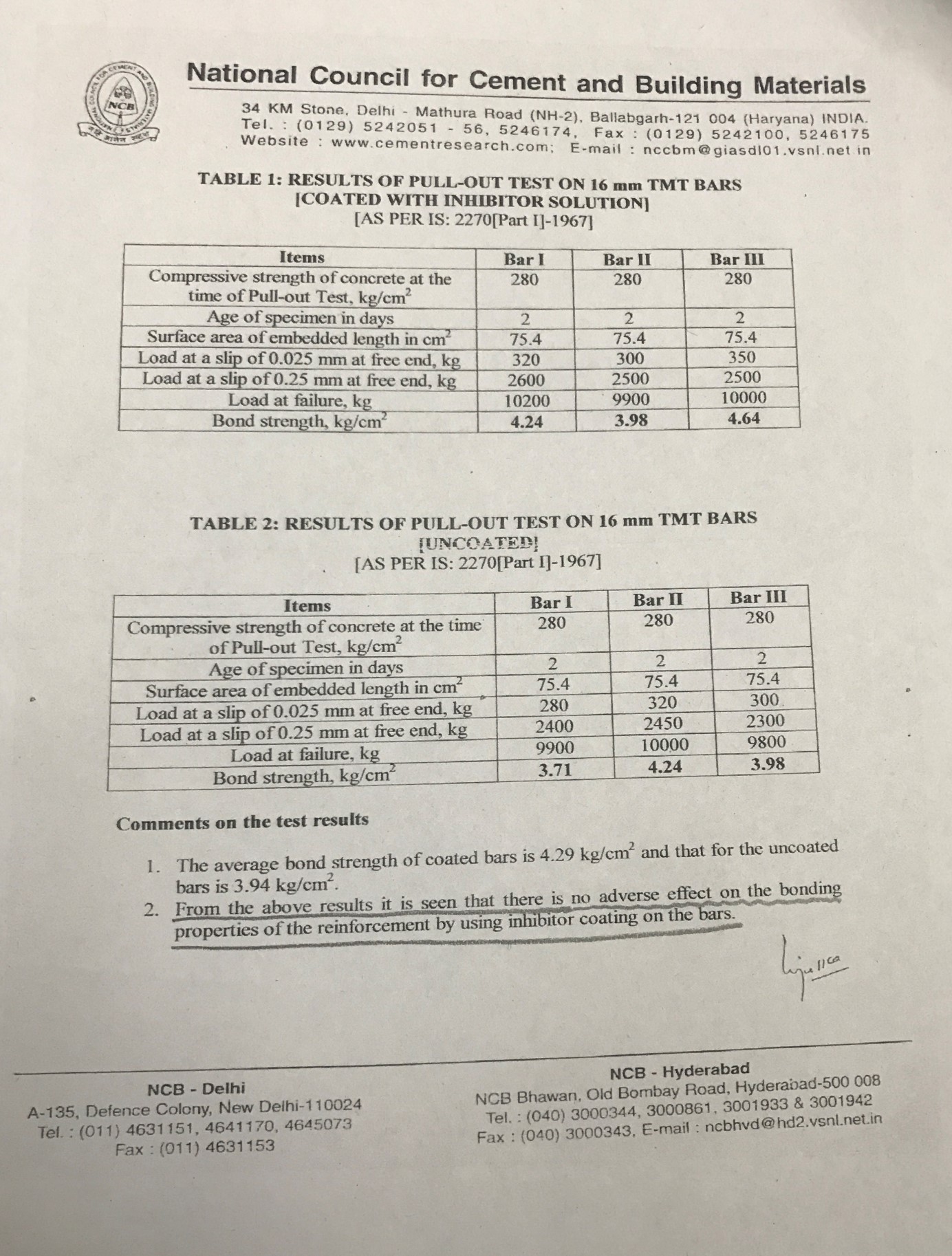 Pull-Out Test on 16 mm TMT bars coated with Inhibitor Solution done by National Council of Cement and Building Material :